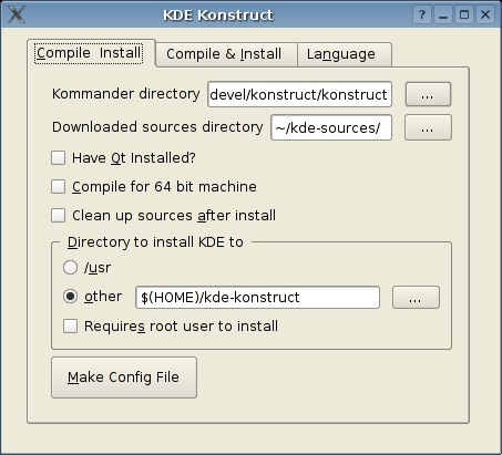 = Graphical Scripting with Kommander = Kommander is a simplified and modified version of Qt Designer which lets you add scripting abilities to the dialogues it makes. It saves the result as a designer UI file which can be run with Kommander Executer. It is the easiest way to make simple programmes, I like to think of it as graphical shell scripting. Konstuct is a program to download and install KDE from sources. This tutorial takes us through using Kommander to make a graphical program to configure and run Konstruct. Final Kommander file: http://www.kde.me.uk/kommander-tutorial/konstruct.kmdr ![]() The final programme made in Kommander ![]() Kommander's editor is where you will create the programme We are using Kommander 1.1 which is currently in development but includes many more features than previous versions. Download it from http://kent.dl.sourceforge.net/sourceforge/kommander/kommander-1.1devel2.tar.bz2 Run Kommander Editor from K-menu -> Development or as kmdr-editor on the command line. Click File->New and choose a dialogue. Our dialogue is going to have 3 parts to it, the first which will make the configuration file, the second will run Konstruct to compile KDE and the third will choose a language to install. We want to start by adding a tab widget which is the green icon A widget with tabs on the toolbar. You could also select it from the menu Tools->Kommander->TabWidget. ![]() Click and drag on your empty dialogue form to create a tab widget covering all of the form. Now we want to make our form for the configuration file. The first thing we want to know is the directory to write the file to. Click on the first button on the widget toolbar which is the Text Label button. Click on the form inside the tab widget. Now right click on the label and choose Edit Text. Change the text to Kommander Directory. You will probably have to resize the label widget. Click on the button for the file selector widget between the Konsole and tickbox buttons. Click and drag on the canvas to put a file selector widget on your form next to the label. In the Properties box at the bottom left rename the widget you just created from FileSelector1 to outputDir. Further down in the properties box is selectionType, set this to directory. Click on the ExecButton icon in the toolbar, the icon is a button with OK on it. Place the button to the bottom of the form, but still inside the tab widget. Double click on the button and set the widget text to Make Config File. We are now ready to add some scripting power to our form. When we load the form we want the Konstruct directory selector widget to be set to the present working directory. We want the value of this outputDir widget that other widgets can see to be set to it's contents plus the name of the configuration file we want to write to. Finally we want the ExecButton to contain a shell script which will create our configuration file. Outside the tab widget but still inside your form right click on the form and select Edit Kommander Text. In the Text for drop down box select initialisation. Set this text to @outputDir.setText(@exec("pwd")). When we run the Kommander script it will set the outputDir widget to contain the output from the command `pwd` which gives us the present working directory. Now right click and Edit Kommander Text on the outputDir widget. Set it's default text to @widgetText. When other widgets ask for the value of outputDir they will now be given whatever text is written in the widget. Don't put any new line at the end of the Kommander text as that new line will be included in the value of the widget. Finally Edit Kommander Text on the Make Config File button. The default Kommander text on an ExecButton such as this is a bash shell script which will be run when the button is clicked. Set it to this script: OUTFILE="@outputDir/gar.conf.mk" echo "testing" > $OUTFILE This defines a variable $OUTFILE and sets it to the value of the outputDir widget plus the name of the configuration file we will be writing to. Then it writes some testing text out to that file. Now save your dialogue as konstruct.kmdr and run it either through the menu Run->Run Dialogue or on the command line as kmdr-executer konstruct.kmdr or by clicking on it in Konqueror. You should be able to select a directory and when you click the button it will create a file called gar.conf.mk with the text "testing". Take a look at the .kmdr file, it's an XML file which contains the dialogue layout and the Kommander scripting. We need to add widgets which will let the user select what options they want in the configuration file. First add a directory widget and label choose the value of where the sources will be downloaded. Set the text of the label to Downloaded Sources directory and the name property of the file selector widget to downloadDir. Set the default Kommander text on downloadDir to GARCHIVEDIR = @widgetText then set this to be written out to the configuration file by setting the Make Config File button's Kommander text script to be OUTFILE="@outputDir/OUTPUT" echo "@downloadDir" > $OUTFILE Add to the initialisation Kommander text for the form @downloadDir.setText("~/kde-sources/"). Next add three tickboxes to the form (note that in US English a tickbox is called a checkbox), set their labels to Have Qt Installed, Compile for 64 bit machines and Clean up sources after install. Give them name properties of HAVEQT, HAVE64 and BUILDCLEAN. Tickboxes can have different Kommander text values depending on whether they are ticked or not. Set the Kommander text for HAVEQT when ticked to be HAVE_QT_3_3_INSTALLED = true and when unticked to be HAVE_QT_3_3_INSTALLED = false. For HAVE64 set it's Kommander text to be HAVE_64BIT_TARGET = true when true and HAVE_64BIT_TARGET = false when false. Finally the BUILDCLEAN tickbox should be BUILD_CLEAN = true when ticked and BUILD_CLEAN = false when unticked. Edit the Kommander Text of the Make Config File button and add this to the end of it